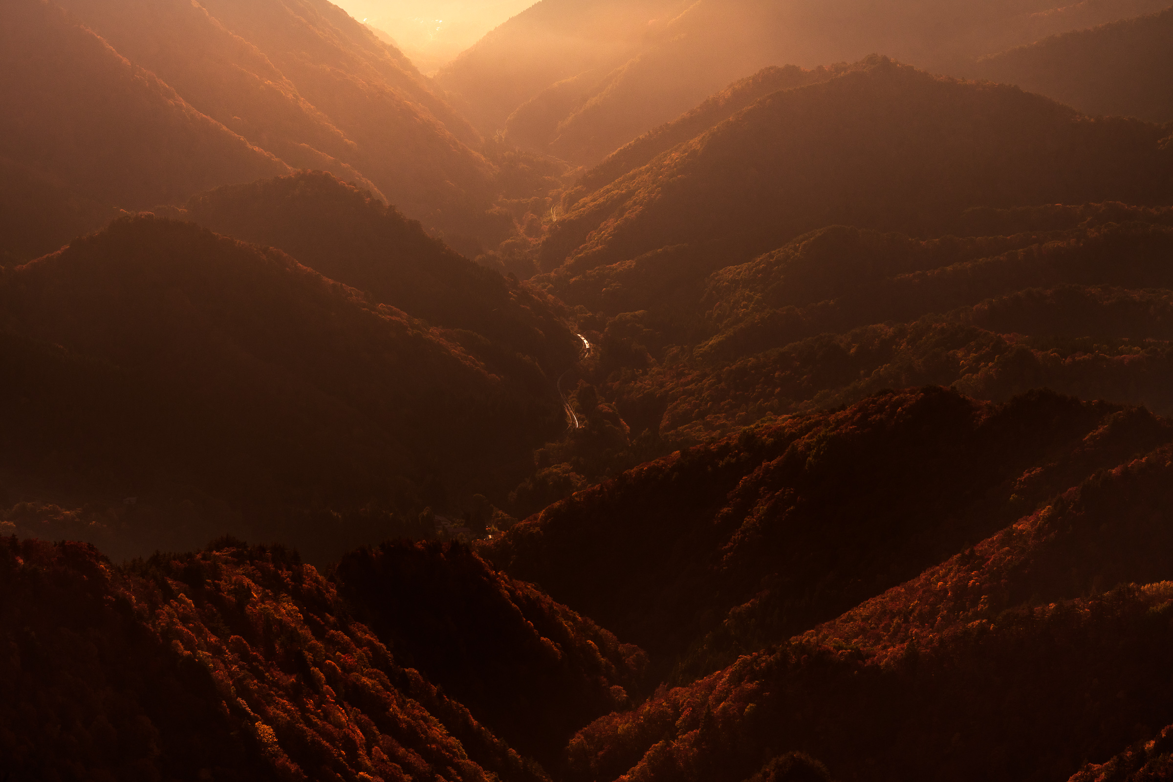 2023.10.31 仙山線 面白山高原ー山寺 仙山線を代表する俯瞰、といえば奥新川の林道俯瞰が第一に挙げられるだろう。一面の深い山の中に、ぽつんと見える赤い鉄橋。知名度、ポテンシャル共に第一級の撮影地であることに間違いはない。しかし、少々 “スケール感” に不足があるのではないか? 上には上があるはずだ。そしてたどり着いたのがここ、奥羽山脈に位置する中面白山付近からの大俯瞰である。仙台と山形を結ぶ仙山線、その二都市を分け隔てる山脈の稜線上から撮影しようという魂胆である。まさしく一番上からの撮影といえる。バリ晴れ、俯瞰日和のチャンスを虎視眈々とうかがっていた。最初の機会は2023年5月の中旬。一面が緑になった時期を狙って訪れた。登山道を登ること2時間、眼下には思い描いていた通りの雄大な景色と、谷間を縫う1本の線路がまさしく見えた。あれから約半年、紅葉の季節はいったいどんな景色を見せてくれるのだろうか? 10月の最終日、2度目の撮影に向かった。狙うは15時台の列車。13時の列車で駅に降り、登山を開始。2時間後、眼下には思い描いていた以上の景色が広がっていた。逆光に霞んだ紅葉の谷間に線路が輝いていた。そこには確かな存在感があった。大興奮でカメラを構え、間もなく現れる列車を待った。 現在、仙台と山形を結ぶ道路には主に二つのルートがある。一つは笹谷峠を通るルート、もう一つは関山峠を通るルートである。しかし、いずれも仙山線の通るルートからは大きく迂回しており、面白山付近で県境を越えるものは鉄道のみである。短い区間ながらも仙山線の峠越えに山深さを感じるのは、この点が大きいのではないかと思う。 1時間後の列車まで粘って撮影を続けていると日没の時刻になった。さあ、帰ろう。改めて仙台側の景色と山形側の景色を目に収め、機材を片付けた。夕方の稜線は最初から最後まで一人きりであった。次第に霧が出てきて線路はいつの間にか見えなくなった。 2024年10月19日 公開 コメントはこちらのフォームからお願いします。(一言でも構いません。)https://docs.google.com/forms/d/e/1FAIpQLSdOgEpCaIaTi8WL35ExGBqrvofES0oCWSJtzg8BPeQB8TRxDQ/viewform?usp=sf_link お気に入りの写真に戻るフロントページに戻る