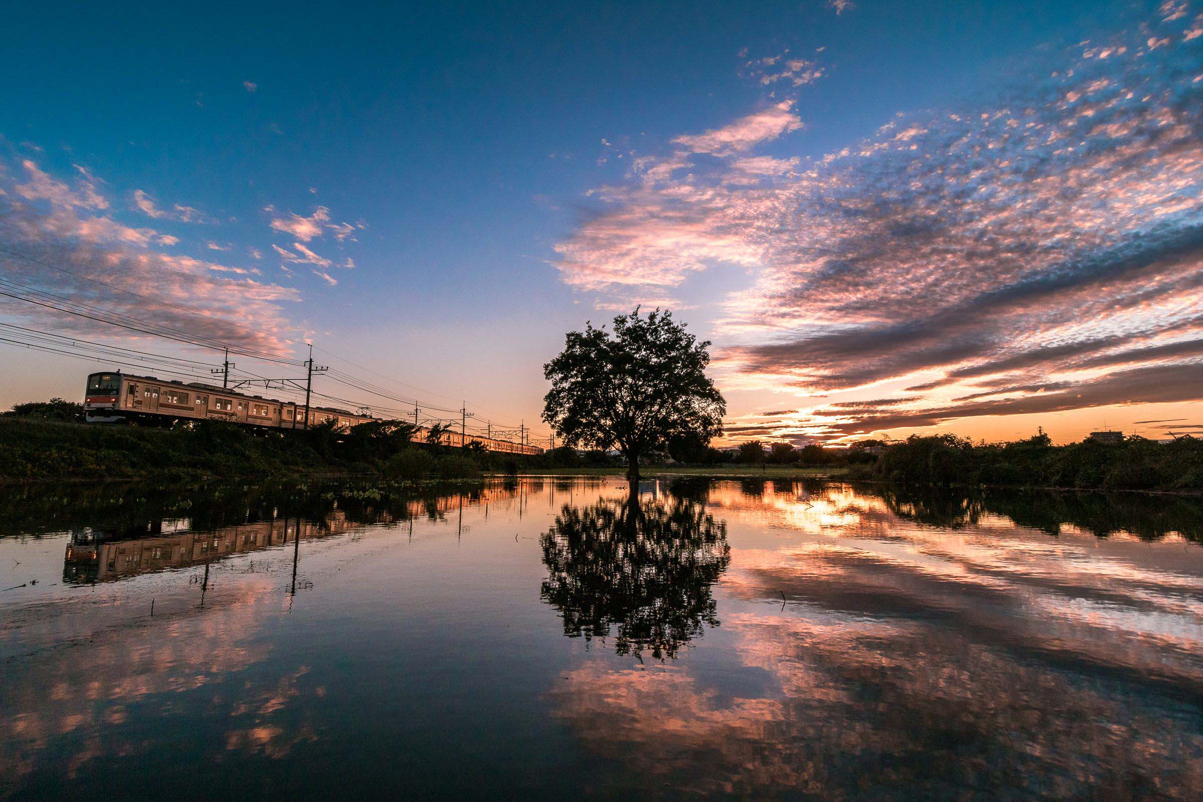 川が氾濫してできた大きな水たまりは鏡のようになった。
