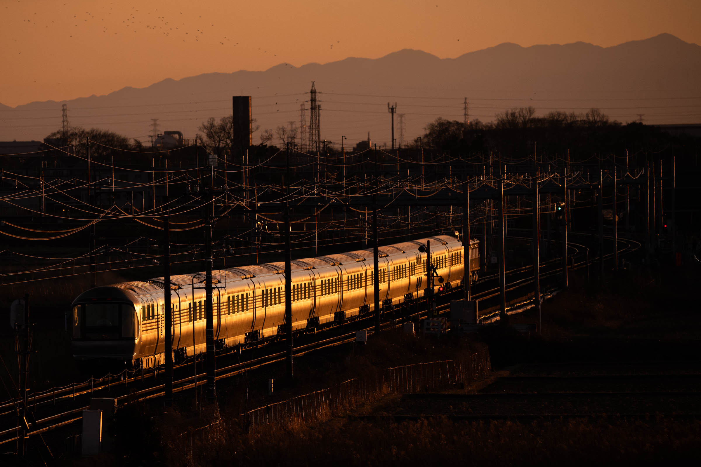 日没直前の黒く沈んだ田園地帯に、13両の車体が輝いた。