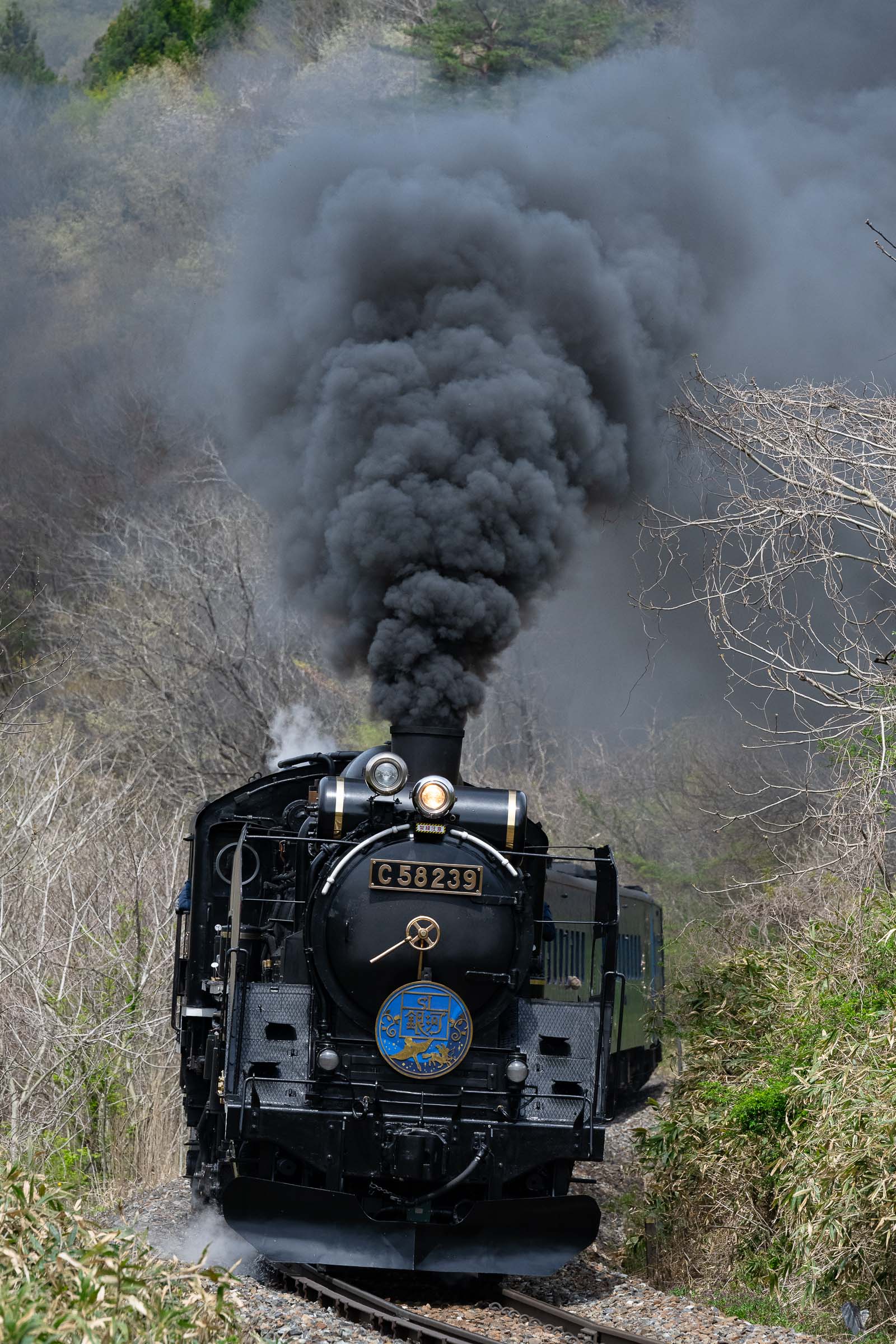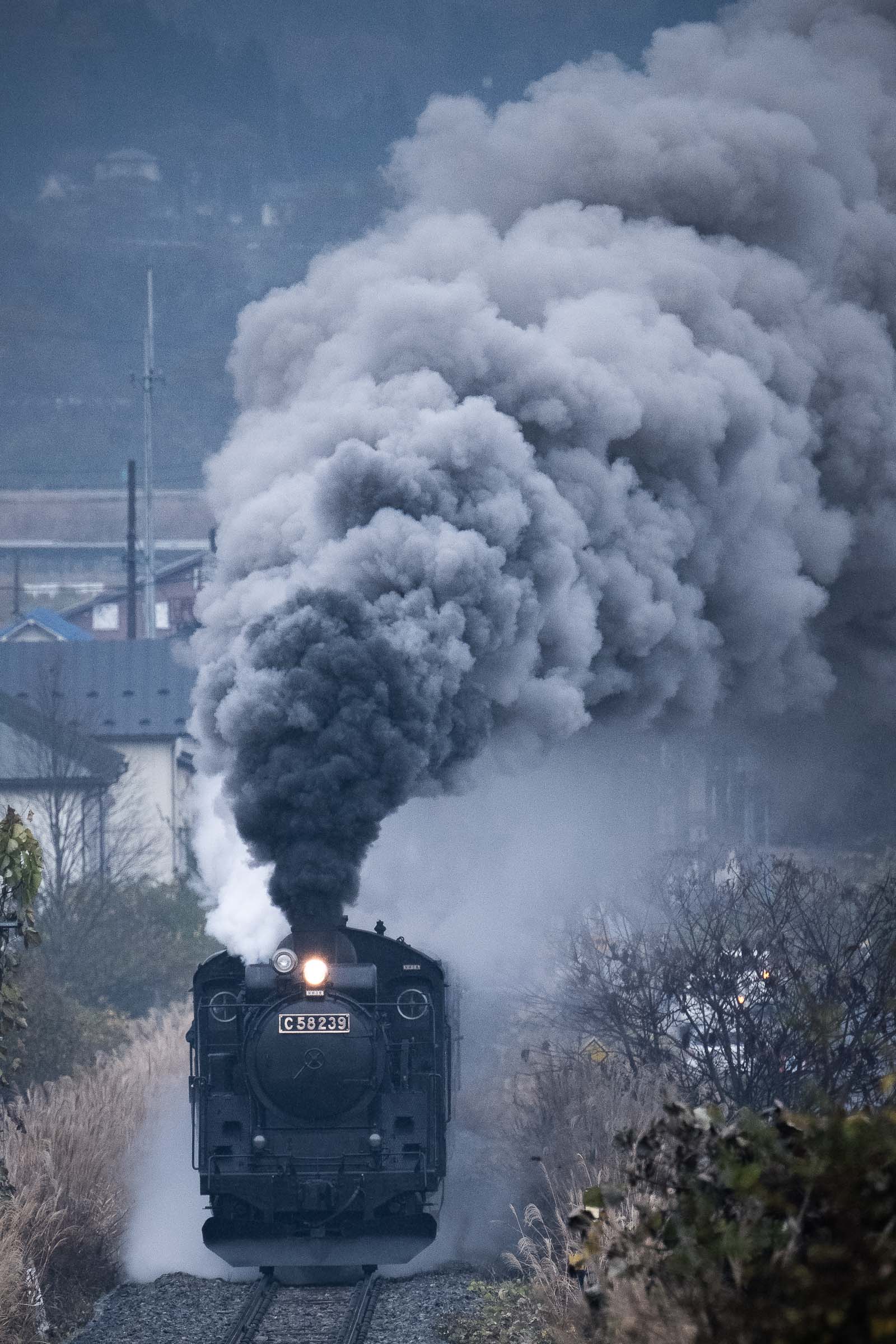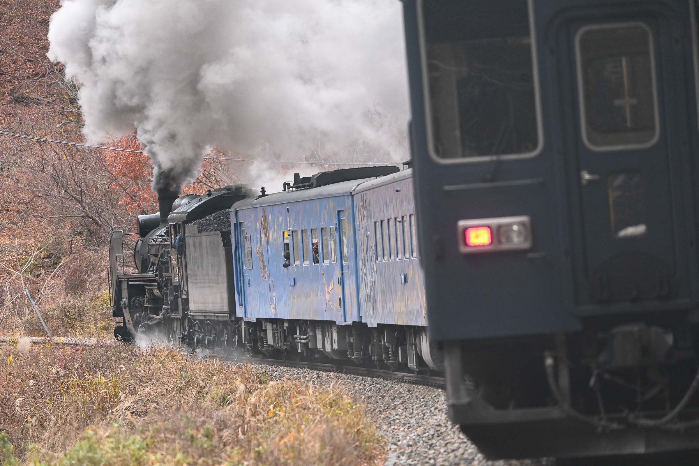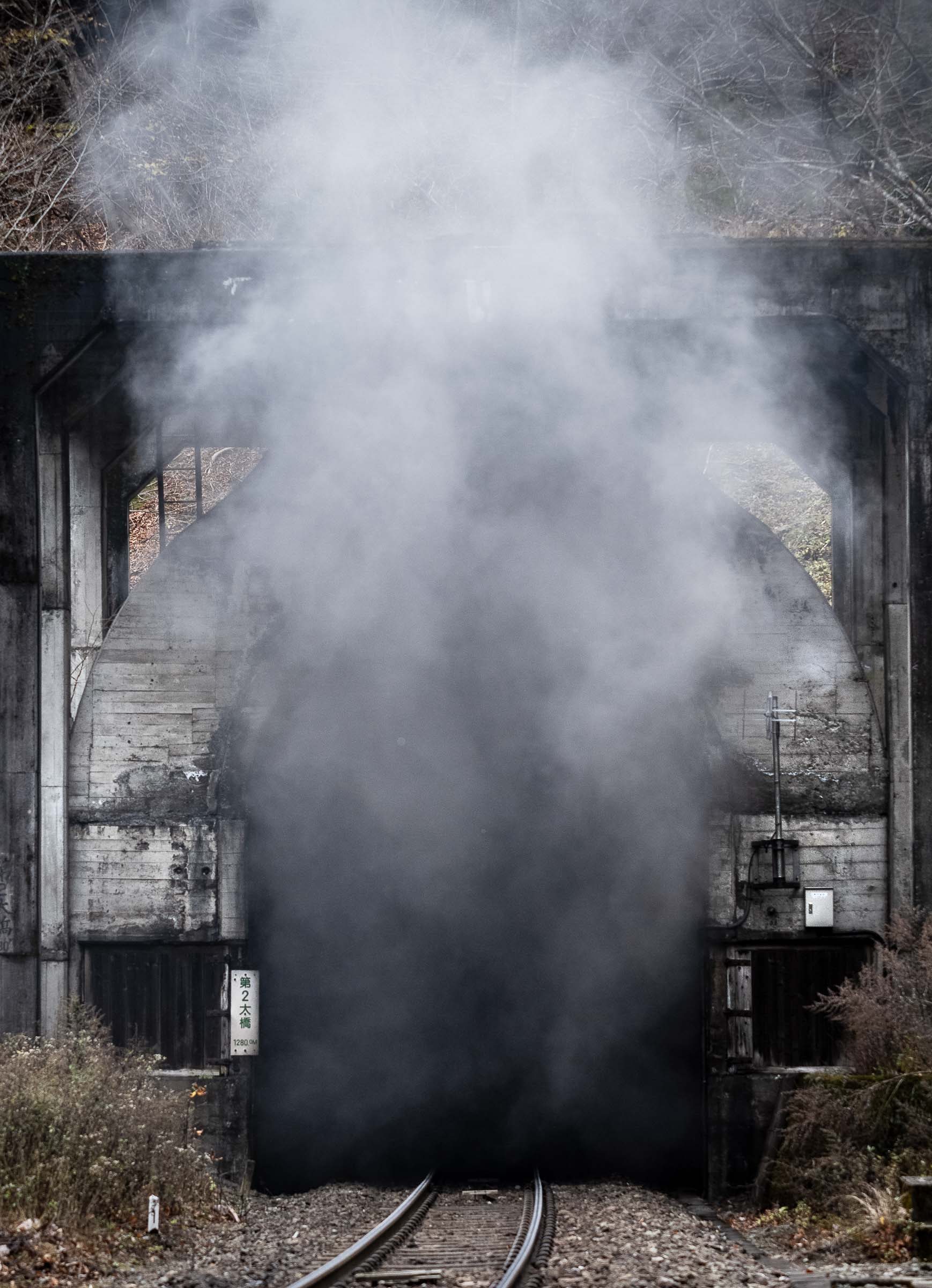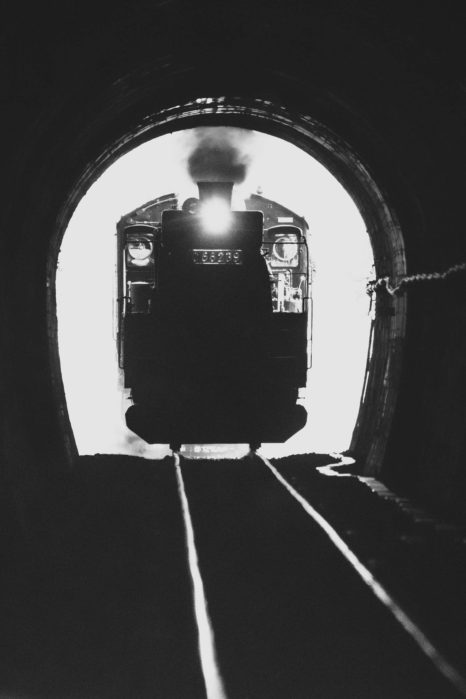 SL銀河の客車はキハ141系改造車(PDC)であり、動力をもった気動車である。大きな役割の一つとして、SLの負担軽減のための急勾配区間での後押しがある。トンネルが連続する仙人峠越えの最深部、SLの煙は控えめである。裏方でPDCは力いっぱい押している。