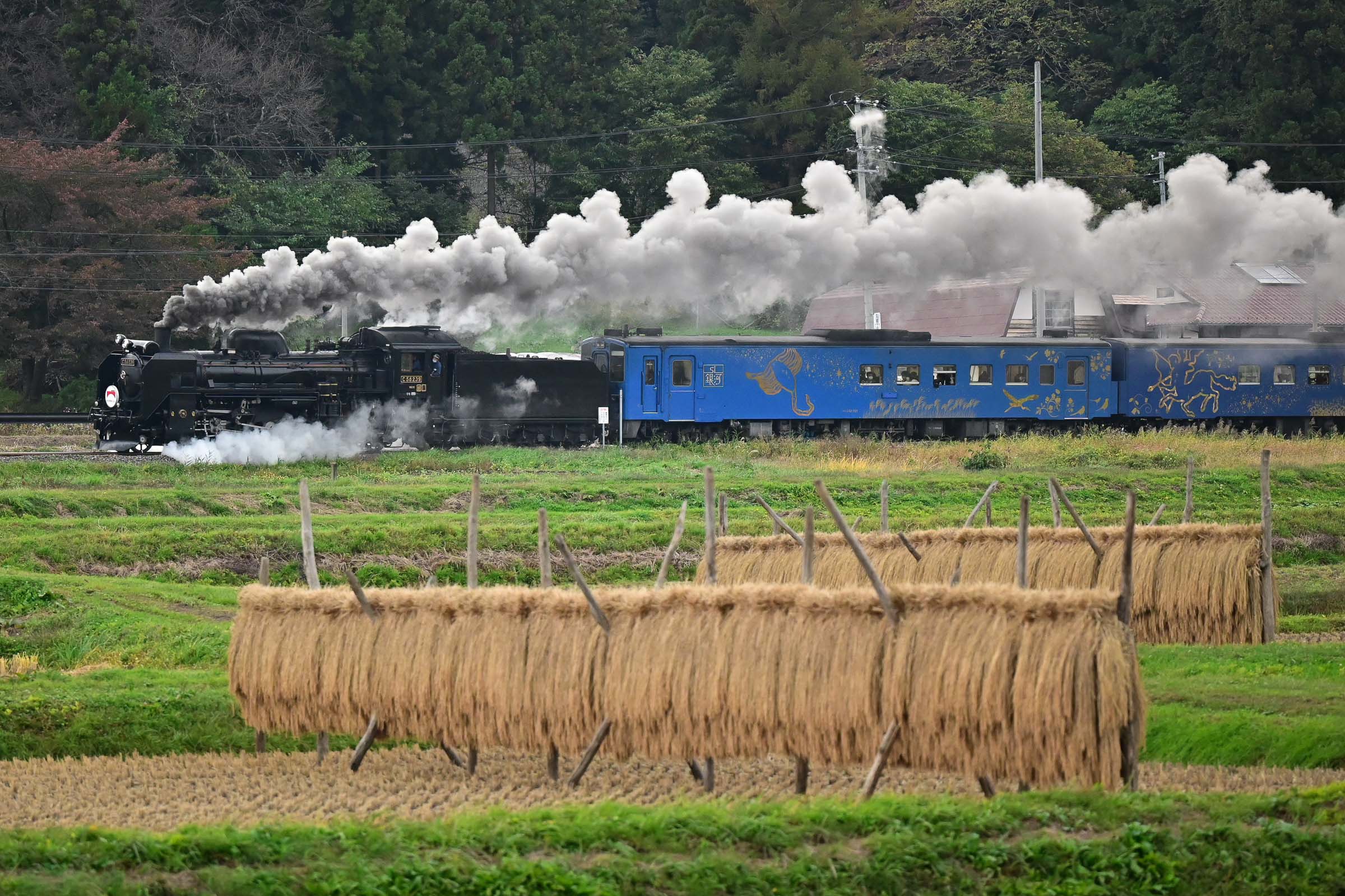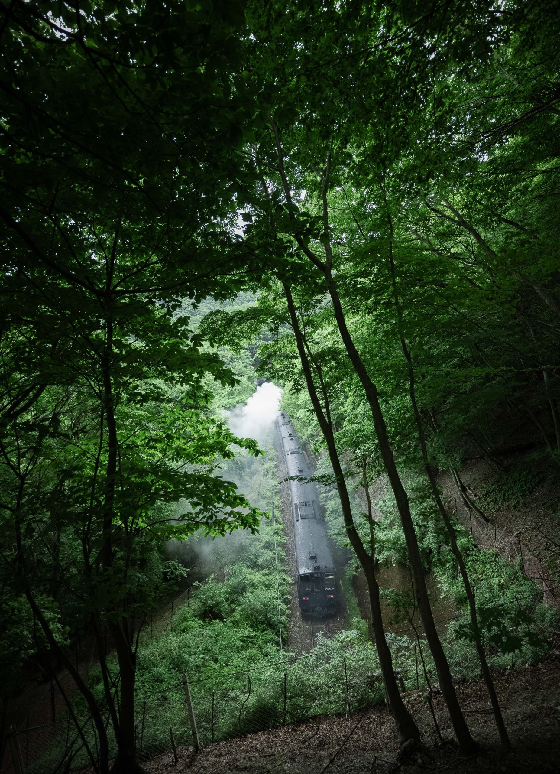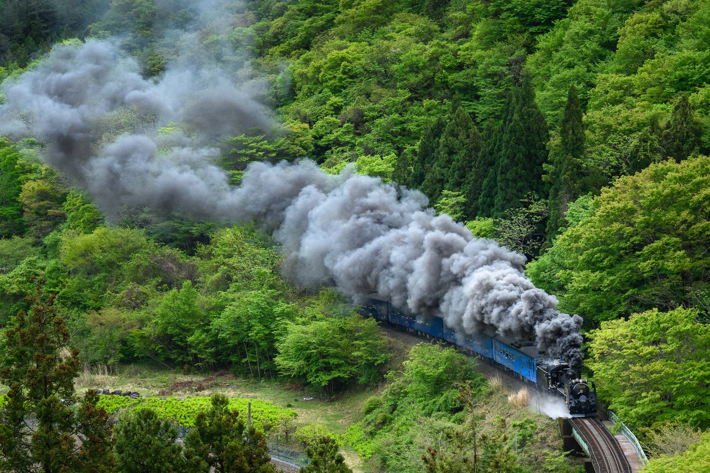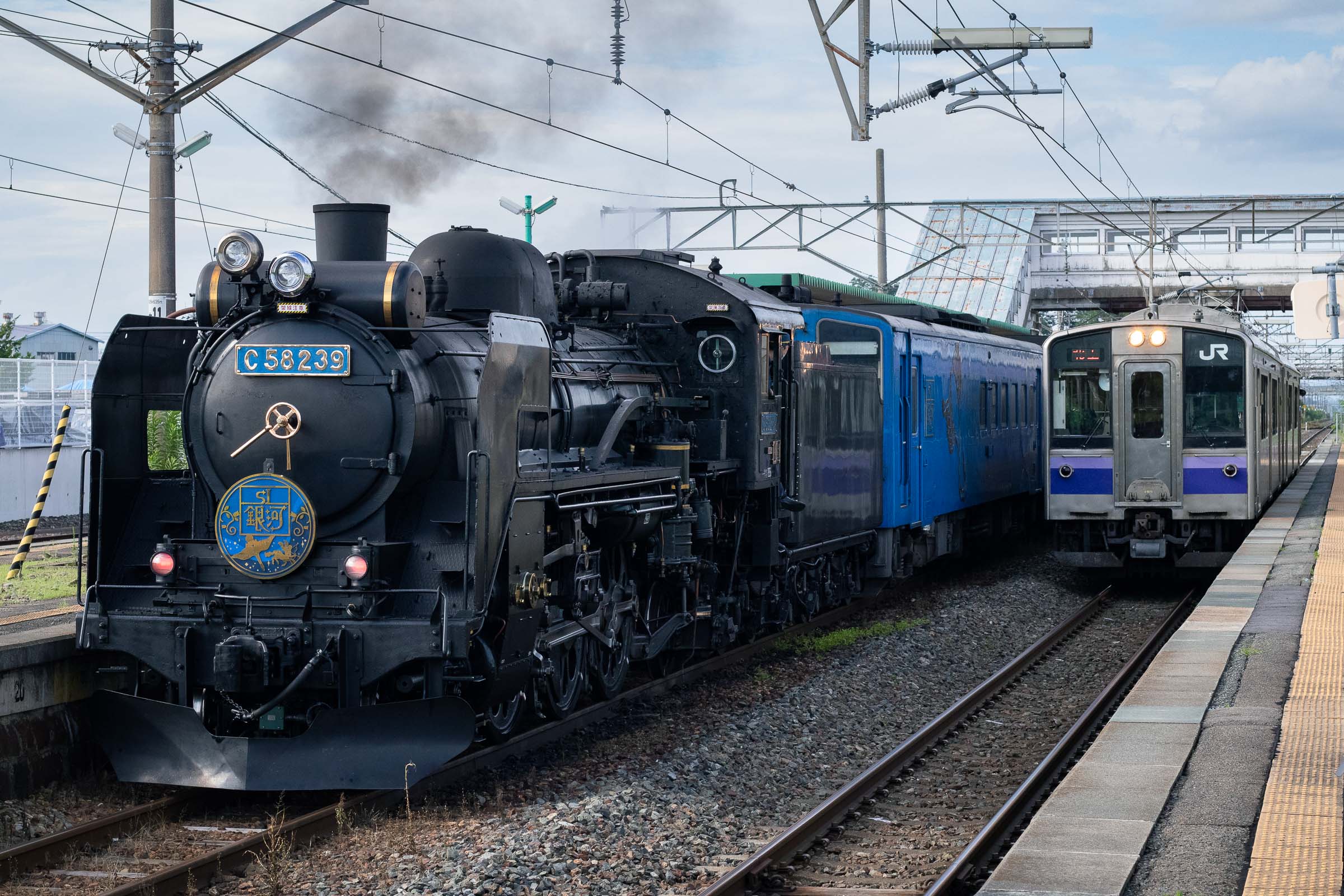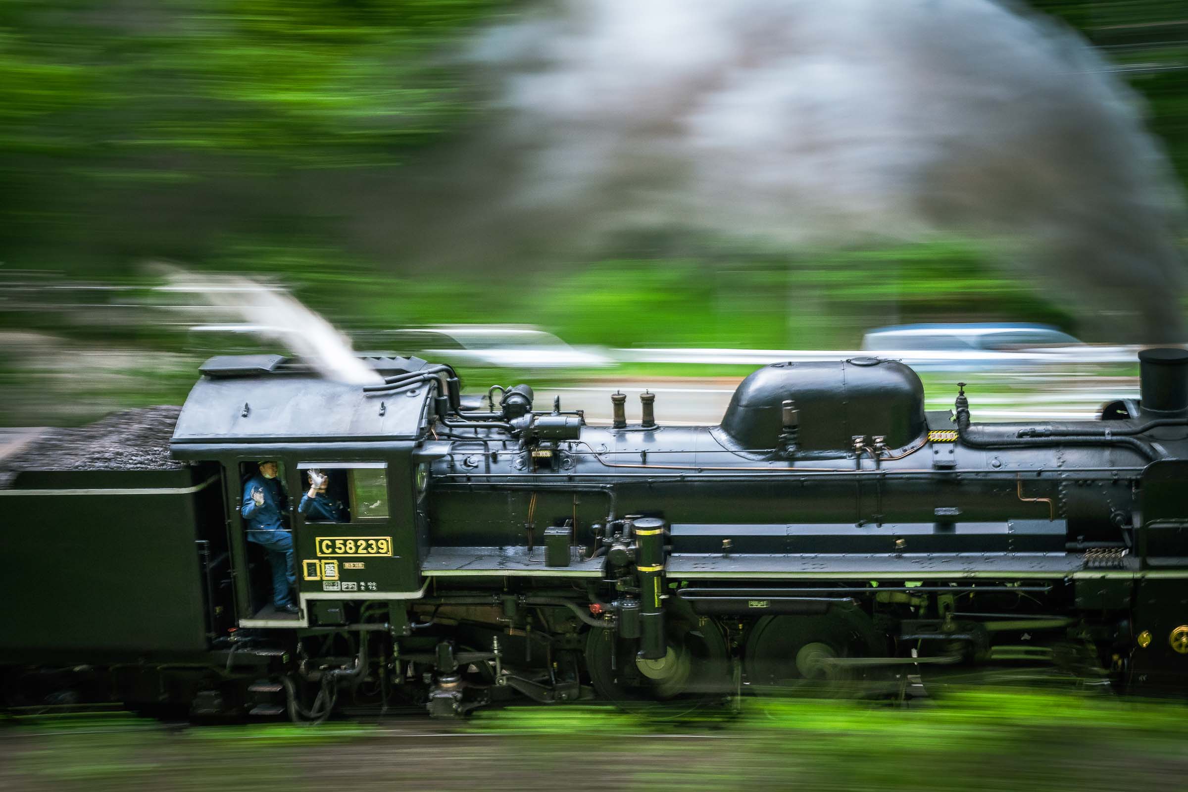 SL銀河の客車はキハ141系改造車(PDC)であり、動力をもった気動車である。大きな役割の一つとして、SLの負担軽減のための急勾配区間での後押しがある。トンネルが連続する仙人峠越えの最深部、SLの煙は控えめである。裏方でPDCは力いっぱい押している。