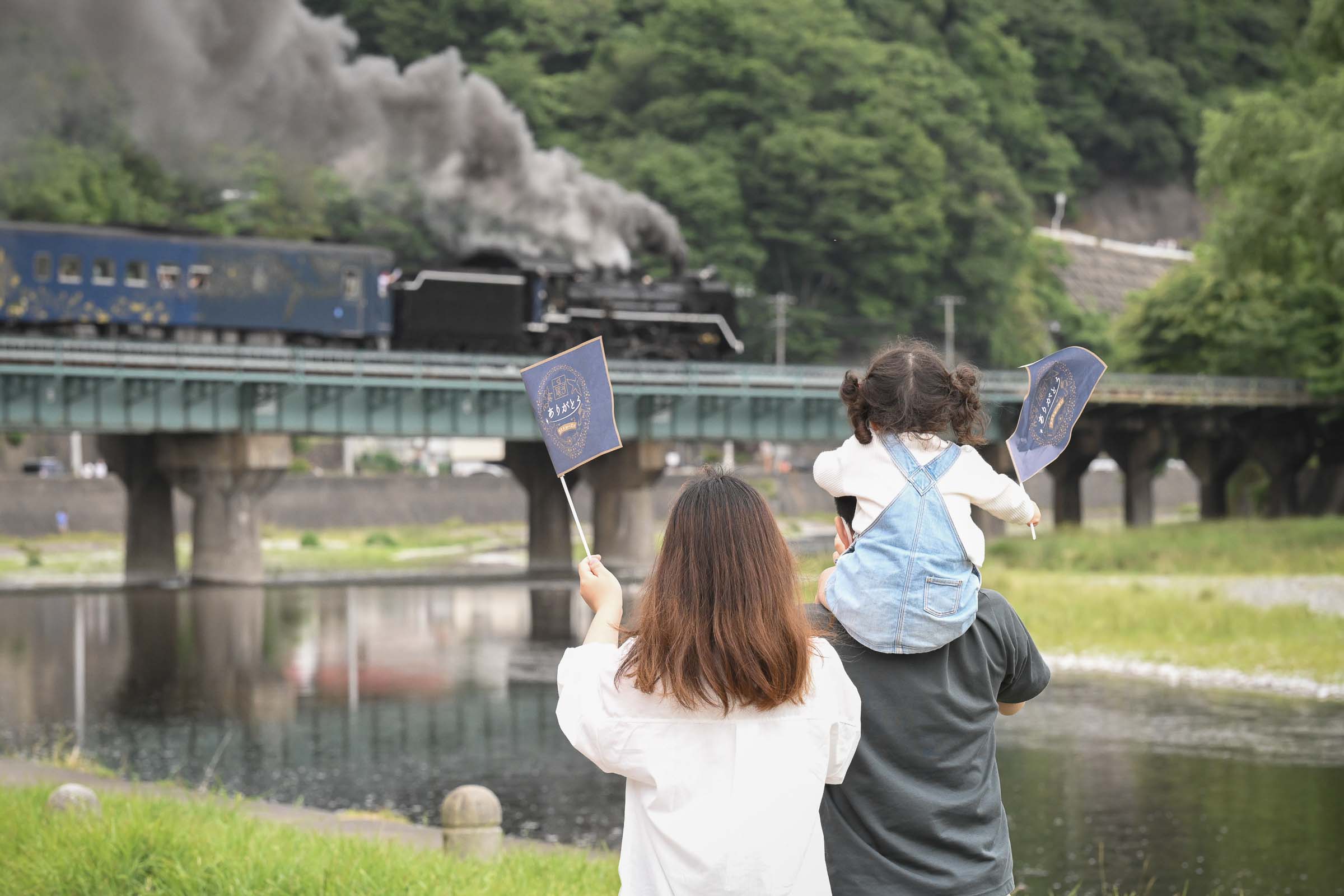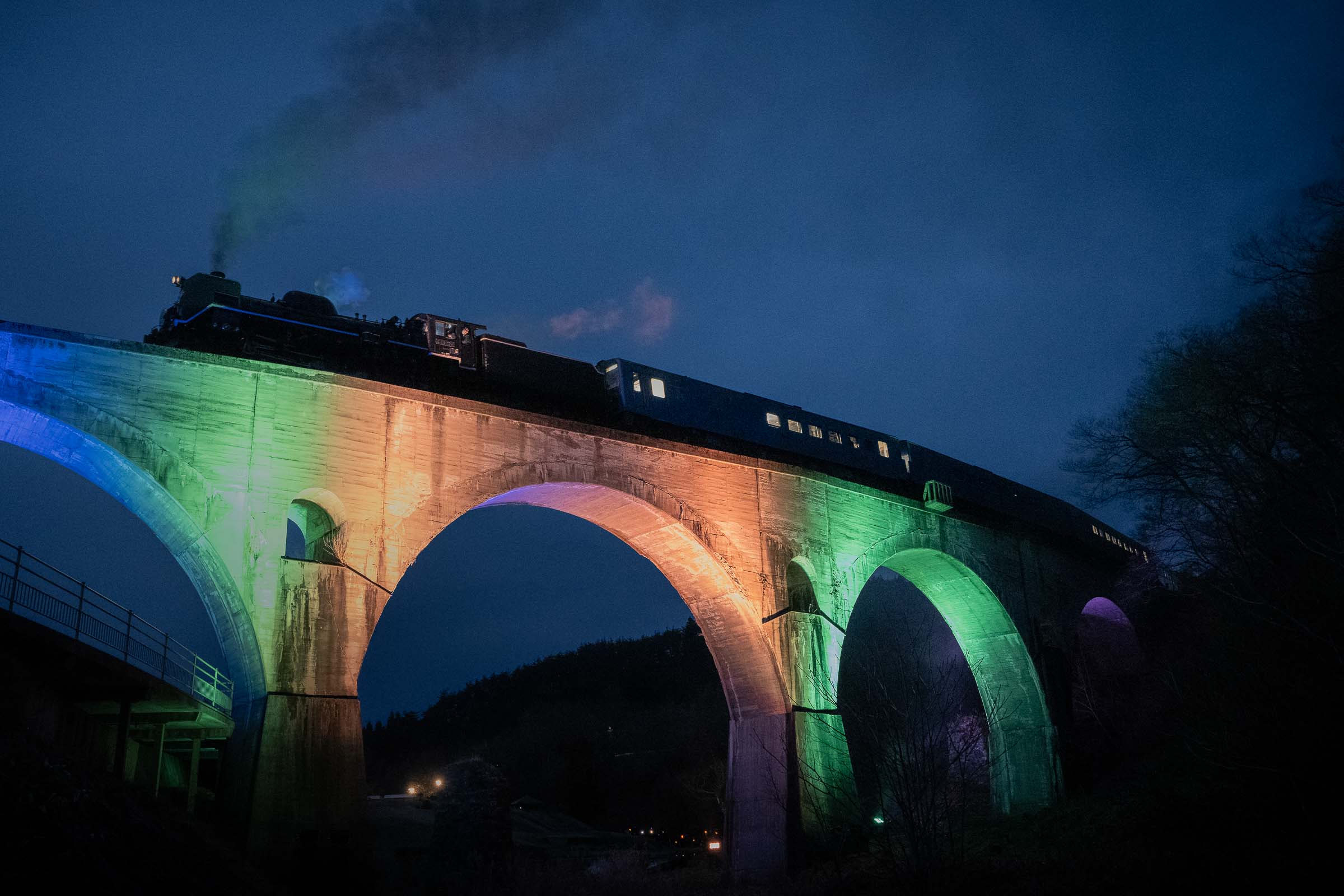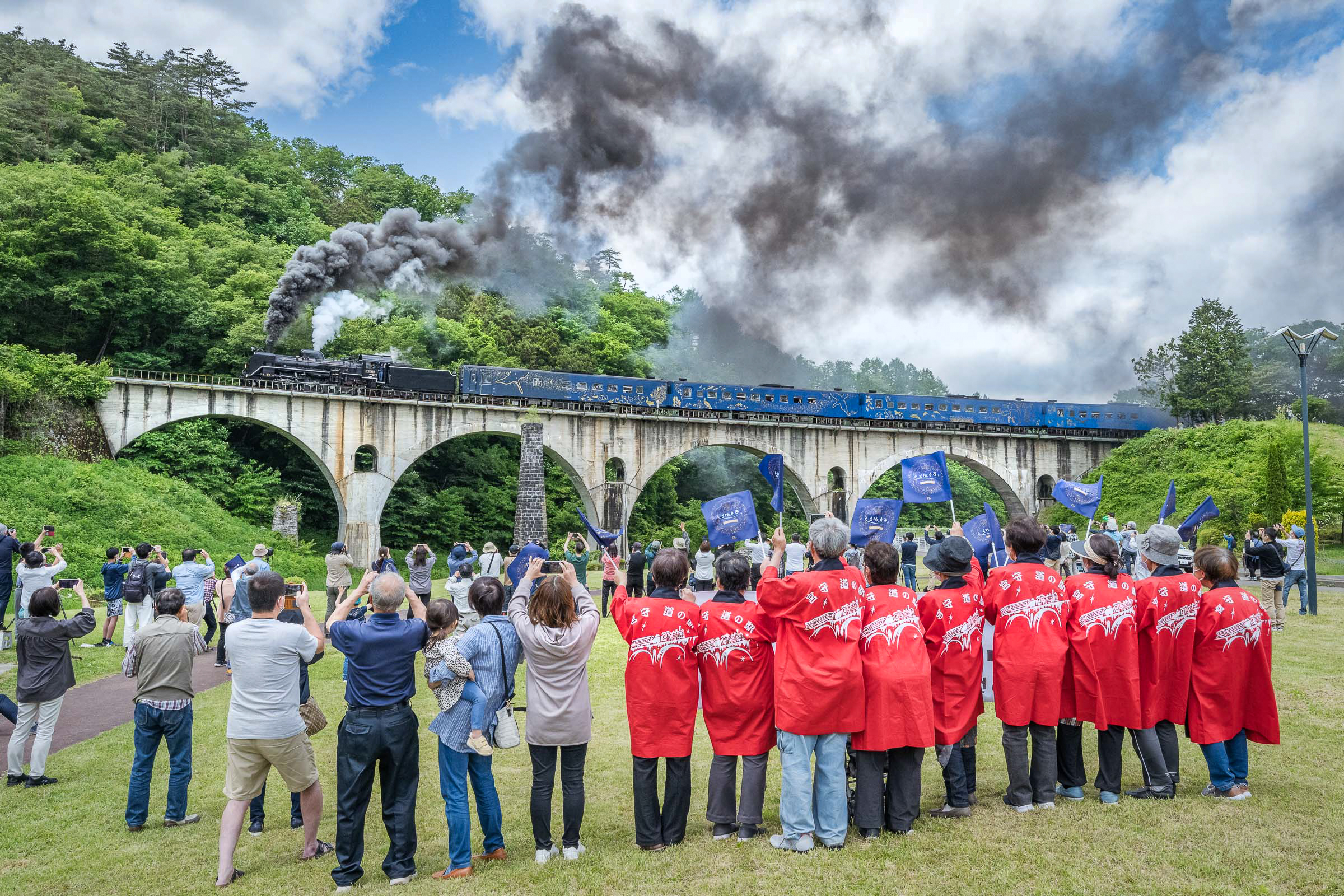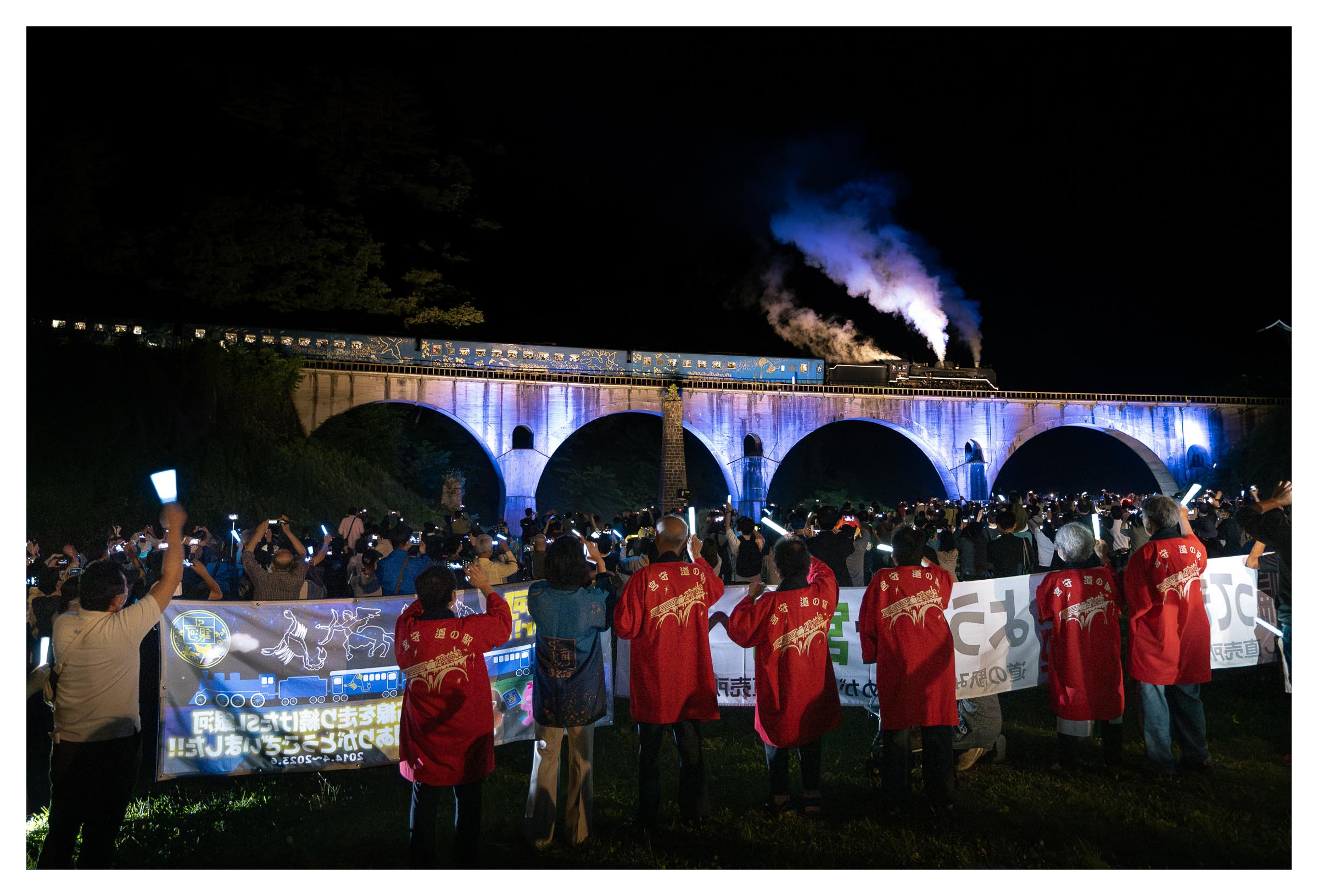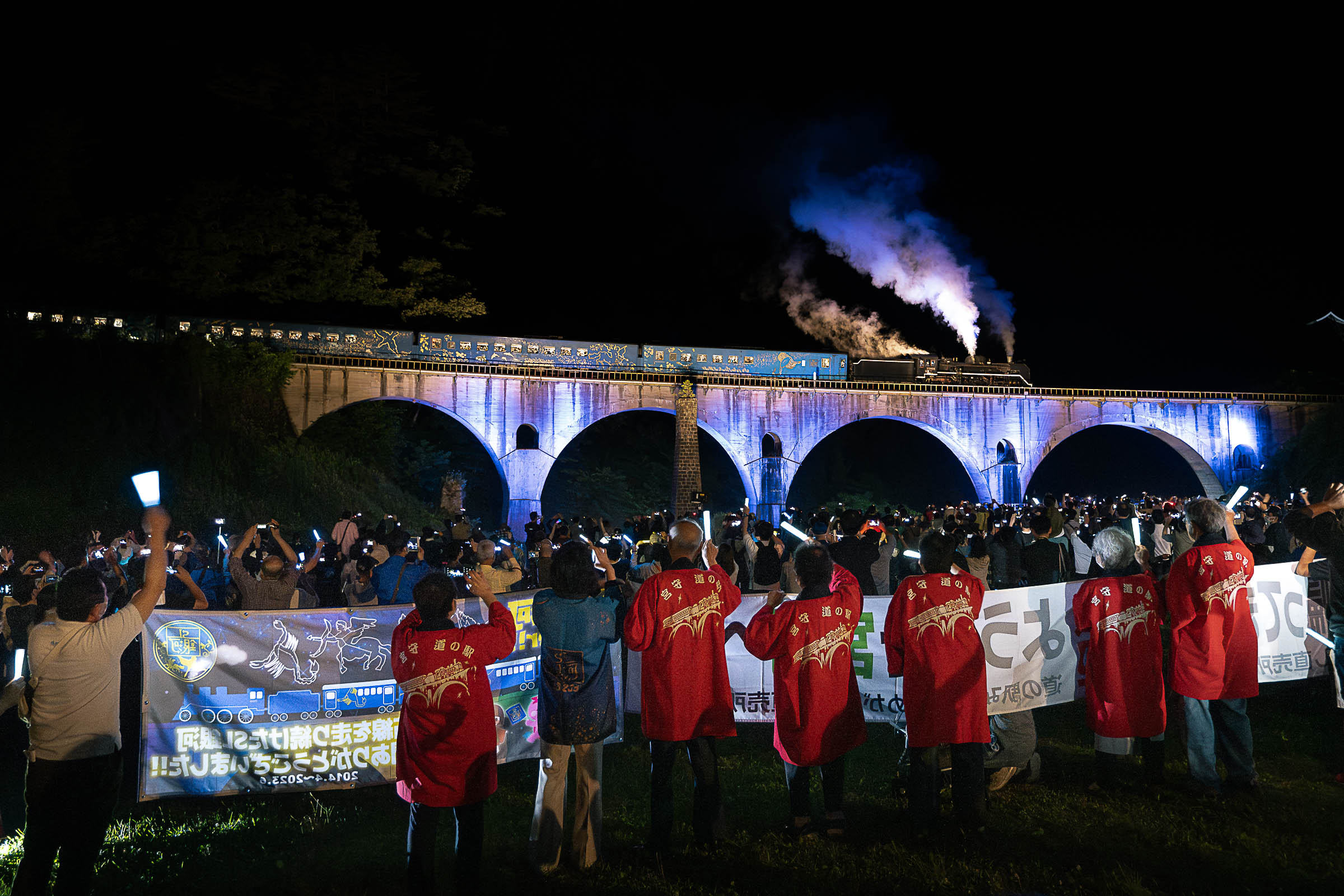 お別れは3分間。無数のペンライトが揺れていた。長い汽笛が2発、めがね橋を去った。ありがとうの声と拍手に見送られて。