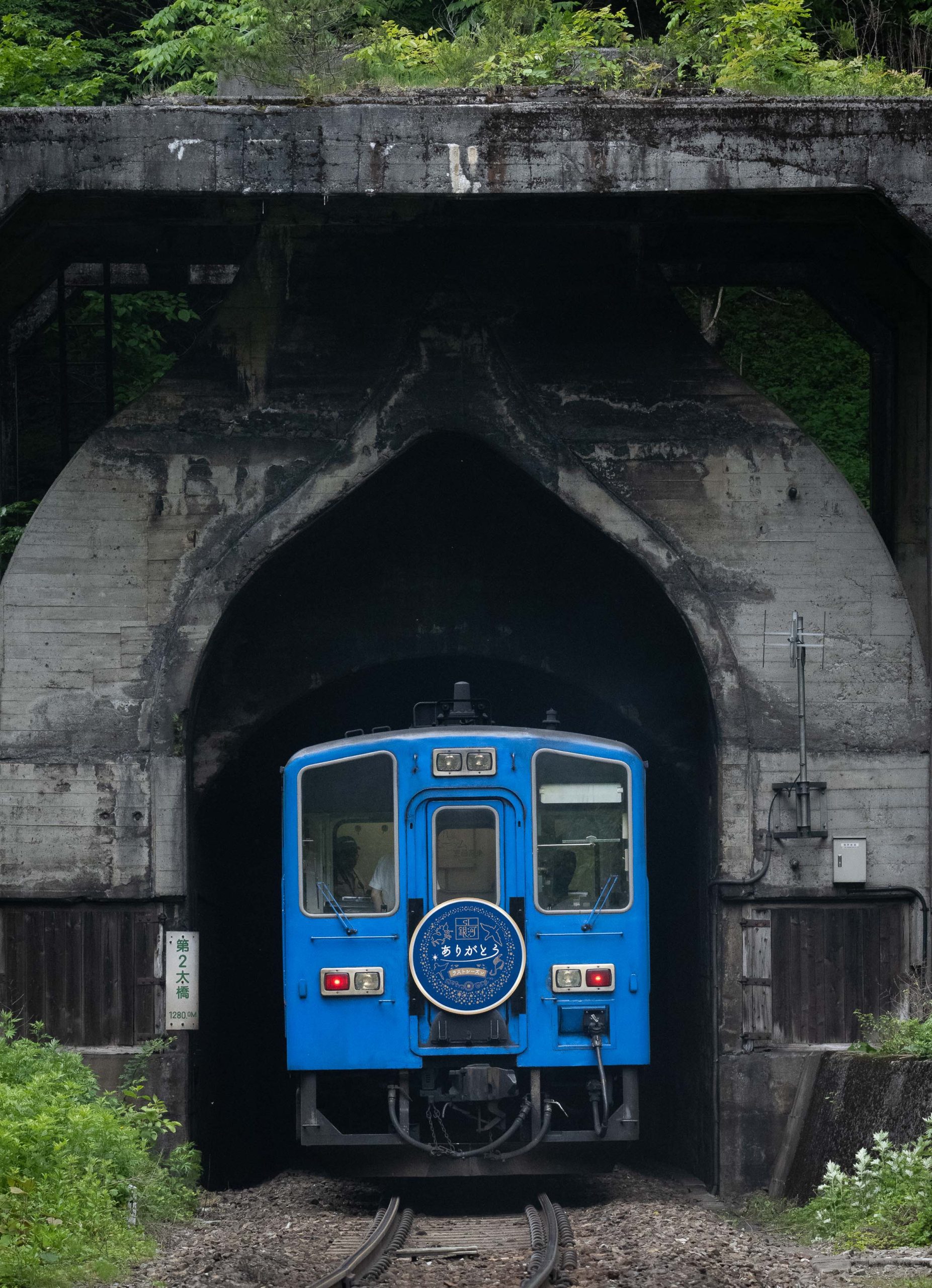 陸中大橋を発車するとすぐに列車はトンネルに突入する。全長1280mの第二大橋トンネルである。特徴的なのはその形である。Ω状のループになっており、入口と出口で進行方向が約180度異なっている。トンネル内は全区間に23‰の急勾配、そしてR250からR300の急カーブが続く。SL現役時代、このトンネルが釜石線で最大の難所であった。