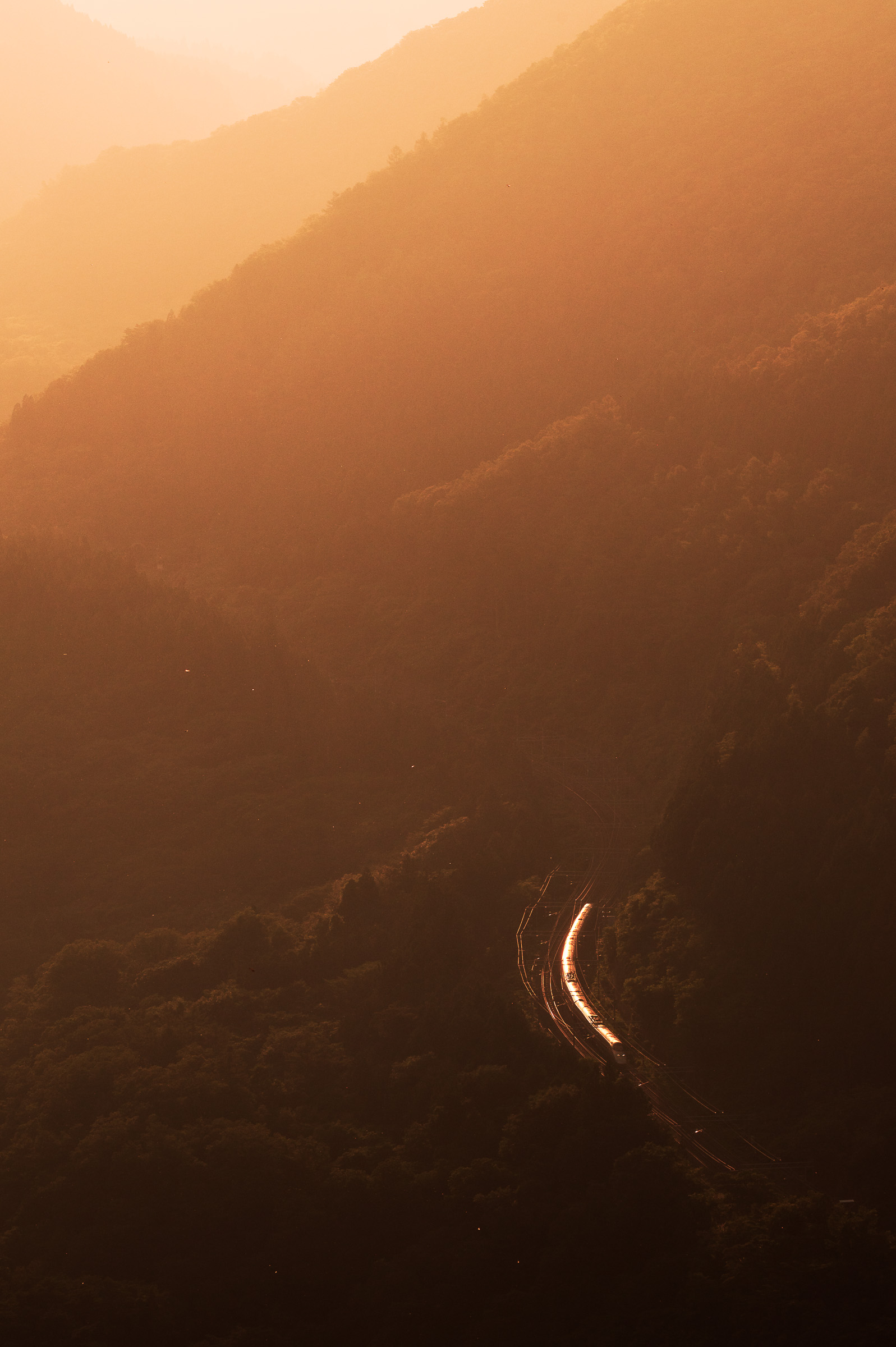 少し間をおいて、ヒグラシの鳴き声に混じって、谷間からファーンという警笛が聞こえた。
