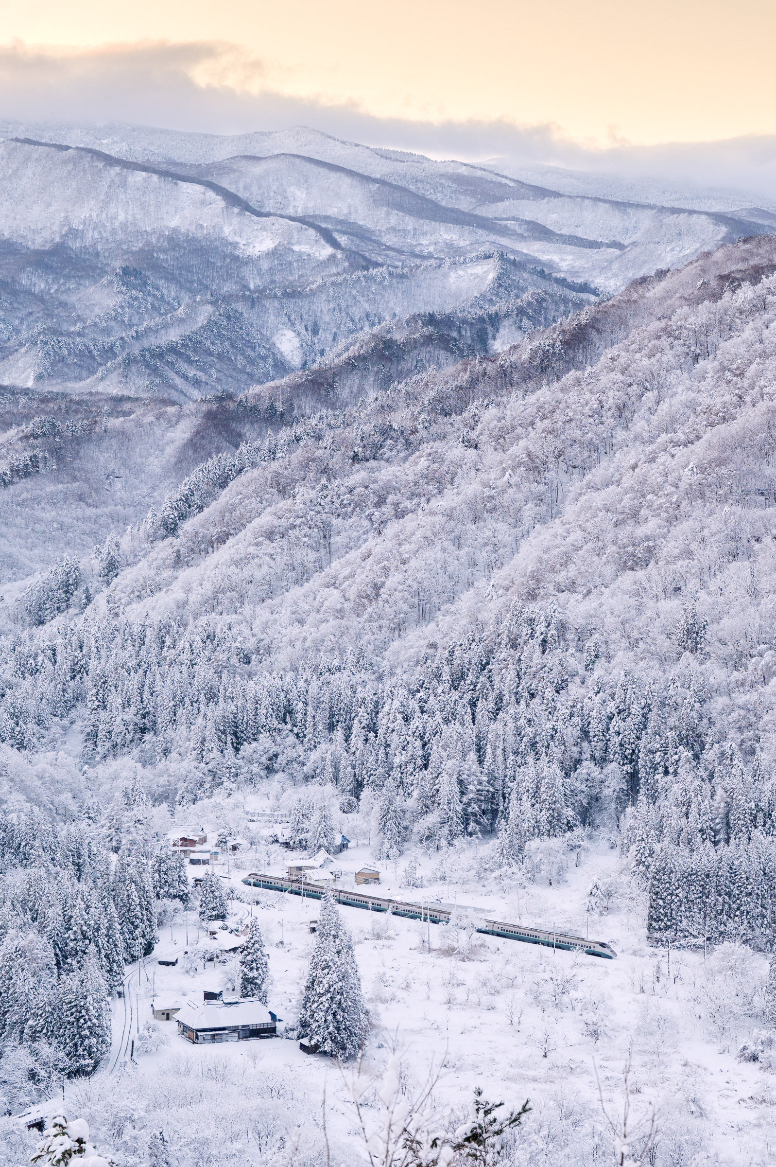以前、某サイトで満月の夜に雪景色の上越線を走る「あけぼの」の写真を見たとき、夜明け前のブルーモーメントのような明るさに驚いたが、今回はじめて自分の目でその光景を実感できた。